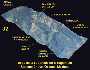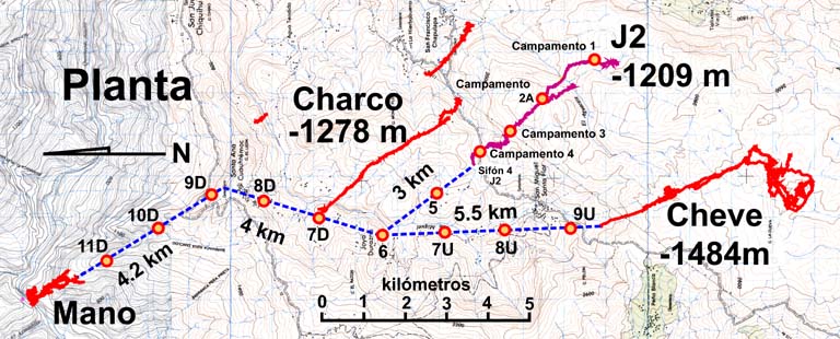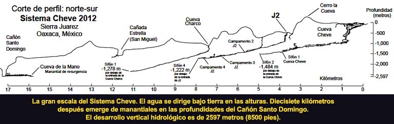 El límite actual de exploración en J2 representa territorios totalmente desconocidos. El mapa en esta página representa la topografía en vista de planta, junto con los sistemas de cuevas conocidos en la Sierra de Juárez. La línea punteada azul representa una hipótesis simplificada de lo que podría haber después de los límites conocidos. Los pasajes actualmente ya explorados han representado un gran esfuerzo a través de más de 25 años y 16 expediciones. La distancia que se tendrá que recorrer bajo tierra podría ser dos a tres veces más que la distancia lineal en la superficie. Son aproximadamente 11 kilómetros de travesía subterránea desde la entrada de J2 hasta el inicio del Sifón 4. Esto es mucho más allá de los límites del cuerpo humano. Para lograr el recorrido se ha partido en segmentos que representan 8 a 12 horas de viaje con una mochila pesada y se han establecido campamentos subterráneos. Hay actualmente cuatro campamentos en J2, con el campamento más remoto (el Campamento 4, establecido en 2009) a una profundidad de -1200 metros y después de más de 220 metros de pasajes subacuáticos. En 2013 se tiene pensado transportar material (equipo de buceo, alimentos, equipo de armado) hasta el Campamento 4 durante las primeras seis semanas del proyecto. A partir del Campamento 4 el equipo de exploración subacuática completará la exploración del Sifón 4 y buscará un lugar para establecer el Campamento 5, más allá de los túneles subacuáticos. El análisis geológico predice que los pasajes tomarán un curso descendente por más de 800 metros después del Sifón 4 hasta el punto donde J2 intersecta el pasaje principal del Sistema Cheve. El mapa muestra con círculos rojos y amarillos los campamentos ya establecidos y los que se podrían necesitar establecer para explorar en su totalidad el Sistema Cheve desde la entrada por J2. Ya que cada campamento representa un día de travesía, una exploración exitosa en el corazón de la Sierra de Juárez significaría permanecer bajo tierra por un mes o más.