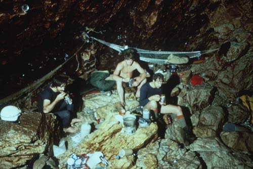 Spartan Outpost: Left to Right: Bob Jefferys, Rob Parker, and Noel Sloan work on a humble meal of freeze dried food at Camp 2, 4.2 kilometers from the entrance and beyond six sumps comprising a kilometer of underwater travel. Camp 2 was occupied for 7 days during the 1984 expedition. Only the clothes worn under each person's wetsuits were taken beyond Camp 1. Just 20 meters beyond this camp lies "Sherwood Shaft," the 55-meter pit leading down to Sump 7.