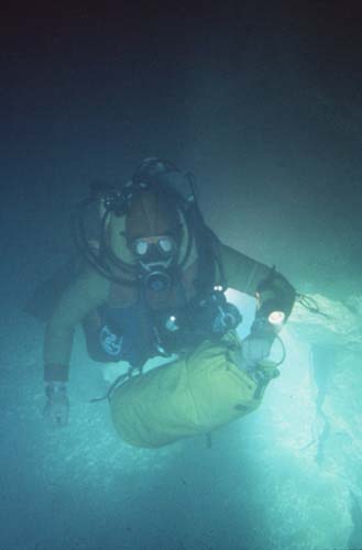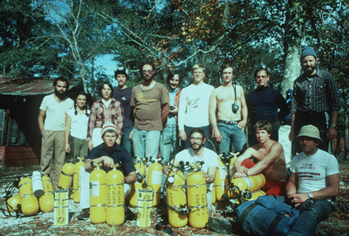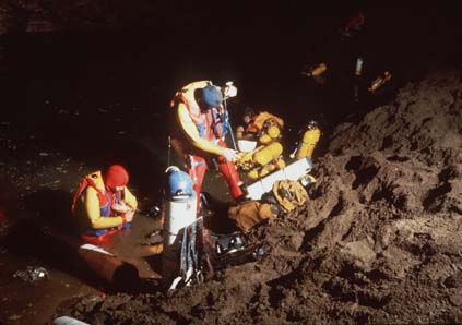 Pat Wiedeman (left), Bob Jefferys, and John Zumrick kit up at Sump 3. This was the first extensive use of composite tanks for cave diving (the dive at the San Agustin Sump in April 1981 was the only previous effort to use this technology). The team used 72 of the composite vessels (manufactured by Acurex [now EFIC]) to traverse six sumps and 4.2 kilometers of dry cave galleries separating the sumps. Sump 3 was 190 meters in length and reached a maximum depth of 22 meters.