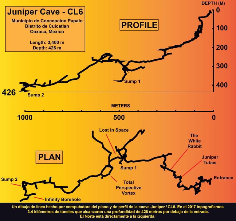 Un breve recuento de la expedición de el 2017 es el siguiente: después de 10 semanas de esfuerzo sostenido, no habíamos encontrado una continuación del paso del río principal más allá del sifón 2 en Cueva Cheve. En ese punto, comenzamos a desarmar la cueva y remover todo el equipo de buceo. Sin embargo, durante las últimas dos semanas de la expedición se hicieron dos descubrimientos extraordinarios. El primero estaba casi en el fondo de la cueva. Un túnel oscuro que conducía en una dirección opuesta a lo que habíamos estado esperando. No llevaba viento ni agua y estaba ascendiendo. Todos estos fueron síntomas de un túnel sin salida o una ruta paralela desde un lugar más alto en la cueva. Pero en un giro extraordinario de acontecimientos se descubrió una "divisoria de aguas", donde, después de ascender por una distancia considerable, el pasaje comenzó de repente a descender en una dirección perpendicular al eje principal de la falla en la que se forma predominantemente la Cueva Cheve. Y, lo más importante, acorde con este cambio de dirección, un fuerte viento apareció de repente, entrando en este nuevo túnel. La presencia de un fuerte flujo de aire en este lugar fue una revelación, ya que el flujo de aire en Cueve Cheve había desaparecido misteriosamente en 1989 cerca de lo que ahora es la ubicación del Campamento 3. Casi al mismo tiempo de este descubrimiento, y con un nivel igual de sorpresa, la entrada a una nueva cueva importante, conocida como Juniper / CL6, fue descubierta a unos dos kilómetros al este de la entrada principal de Cueva Cheve. Al final de la expedición, el último impulso de exploración descubrió 3,5 kilómetros de túnel con una asombrosa sección transversal de 60 metros cuadrados. Nos quedamos sin cuerda y con una vista hacia un pasaje aún más grande. No hay túneles en la Cueva Cheve (durante mucho tiempo considerada la cueva más grande de la Sierra Juárez) que coincidan con las dimensiones de los que se ven en Juniper-CL6. Por lo tanto, hay algunas especulaciones de que Juniper / CL6 puede ser la cueva "maestra" en la Sierra Juárez. La expedición de 2017 concluyó así con dos de los descubrimientos de cuevas más importantes de México en décadas.