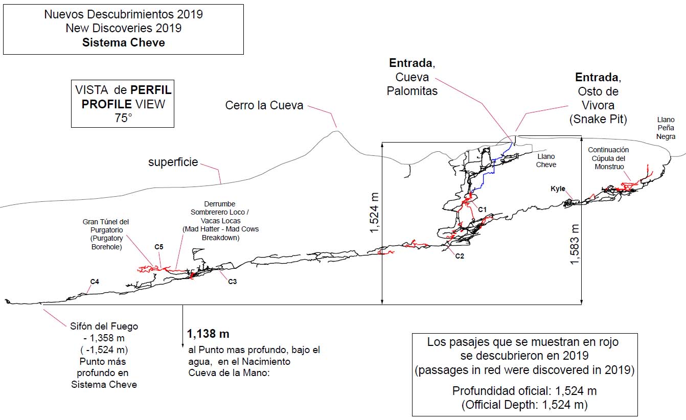 The past three years have seen Cueva Cheve more than double in length (to 55 kilometers) and increase in depth to 1,524m. Most of the additional length came from the Cueva de la Peña Negra, which was discovered in 2017 and connected to Cheve in 2018. In 2019 several more kilometers were added in the Peña Negra, but without major breakthroughs. Nonetheless, there remain many promising leads and new location data on Snake Pit, the highest known entrance in the Cheve karst, show that it is directly above the "60 m Pit" in Peña Negra. A connection with Snake Pit would place the current surveyed system at close to 1,600 meters deep, so there is some merit to scaling the waterfall shaft above the 60m Pit while efforts from the surface continue to push Snake Pit downwards. Significant leads in Peña Negra include continued exploration of Big Gas dome (accessible from Camp Butters); the Shadow Tower Borehole (from Camp Kyle); and a careful investigation of the east wall of the main tunnel between Camps Kyle and Cartman, among others.