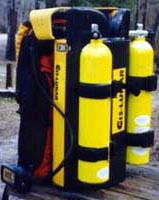 There are two principal architectures used in the design of portable life-support apparatus. These are open-circuit and closed-circuit systems. Open-circuit apparatus, popularized by Cousteau, employs a compressed-gas supply and a demand regulator from which an individual breathes. The exhaust gas is ported overboard with each breath, hence the name "open" circuit. A great deal of useable oxygen still present in the exhaled breathing gas is lost in this manner. Furthermore, the volume of gas expelled with every breath increases with depth. At 100 m depth a standard sport-diving cylinder will provide approximately 30 breaths through an open-circuit regulator before the tank is completely empty. It was this type of apparatus that was used by all exploration teams at Wakulla Springs in 1987. In a closed-circuit system nearly 100% use is made of the oxygen content of the supply gas. This is done by recycling the exhaust through a scrubbing mechanism which removes the carbon dioxide. Gas is added to the system by means of a computer-operated valve when the oxygen content falls below a user specified level. Pound for pound, a fully closed-circuit system will be approximately 200 times more efficient than open-circuit apparatus at the operating depths encountered in Wakulla Springs.